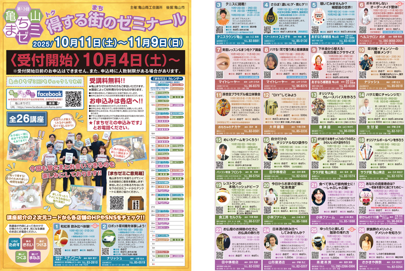 亀山まちゼミで開催する各講座の空き状況と各開催会場の地図について、「亀山まちゼミfacebook」にて掲載しております。